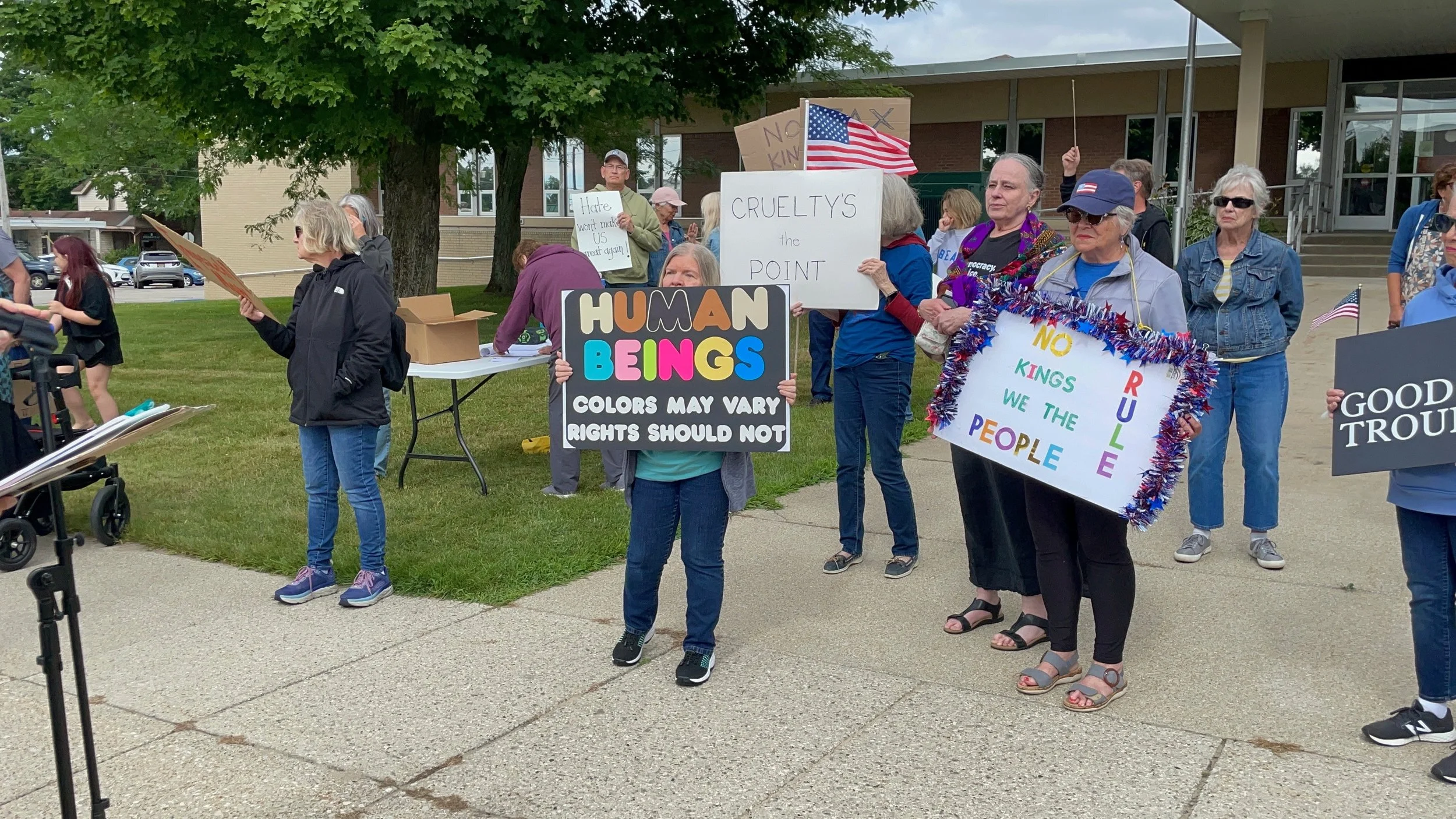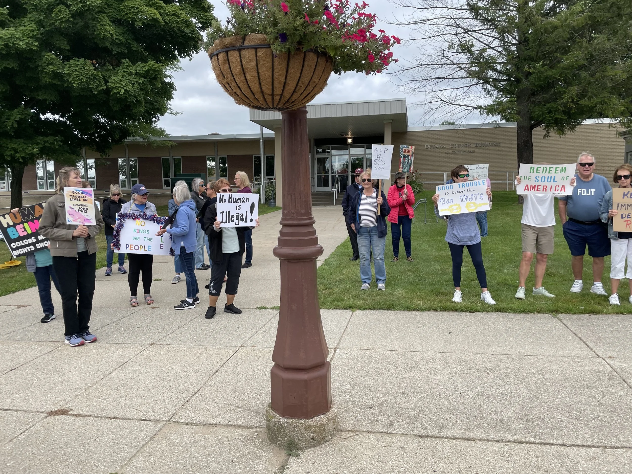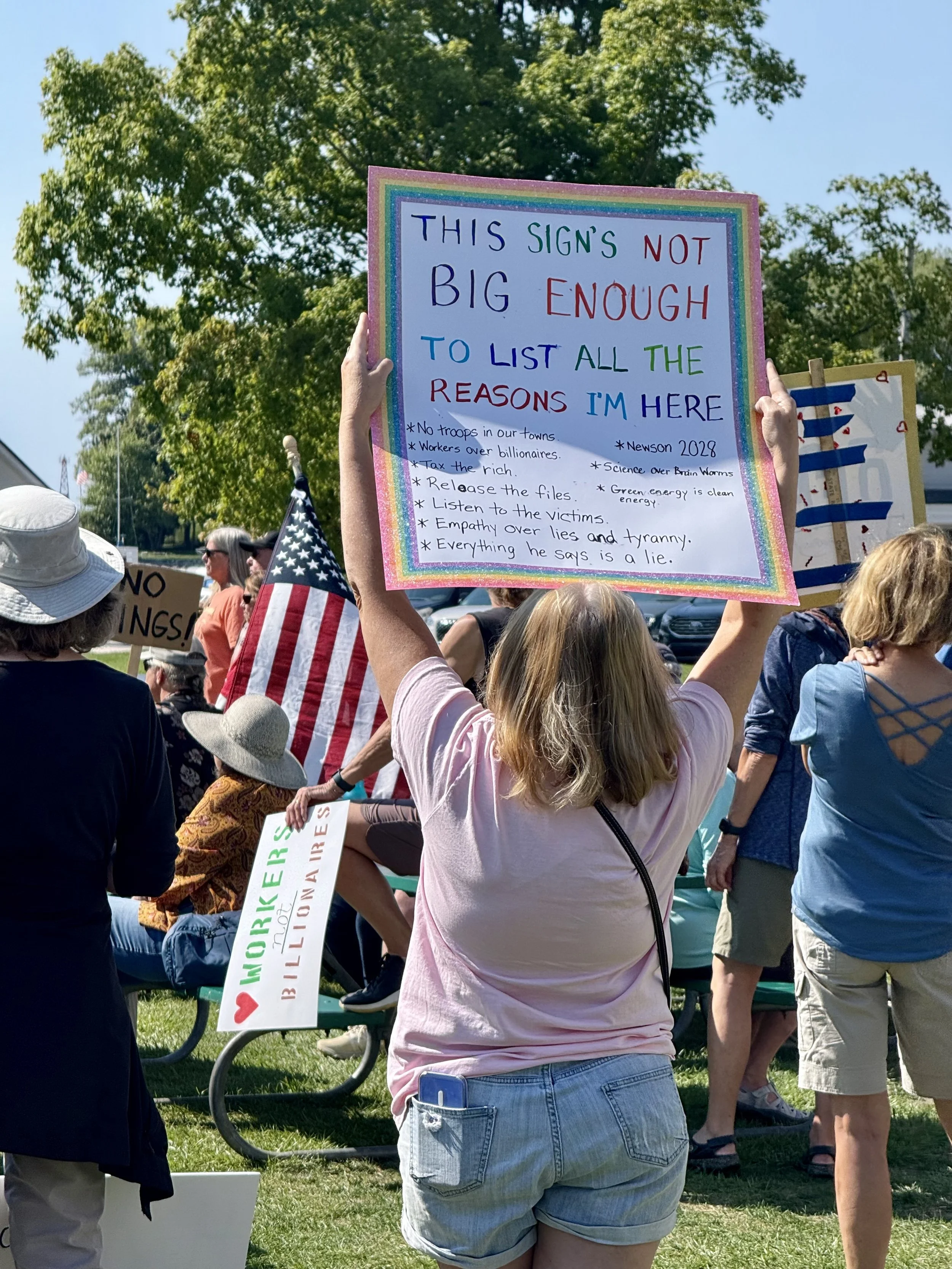 On Labor Day, around 100 folks gathered at the Pentwater Village Green Park in Pentwater, Michigan for a nationwide rally titled “Workers/Laborers Over Billionaires.” The Oceana Country Democrats (OCD) supported this campaign’s efforts which included honoring workers, laborers and unions, protesting against the current administration and reminding the country that workers and laborers are really the wealth generators. Pentwater has a population of around 900 people. At least 24 people spoke at the microphone to tell their personal stories of how the administration’s actions are affecting them, and to remind us that we are strong and that the people have the power.